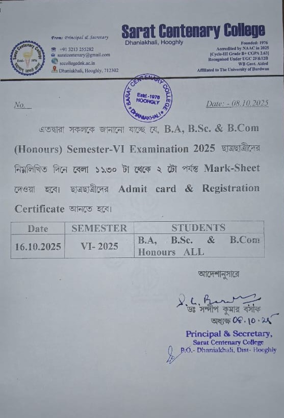 Notice for SEM-6 Honours Result Distribution 2025 08/10/2025 ![]() |
