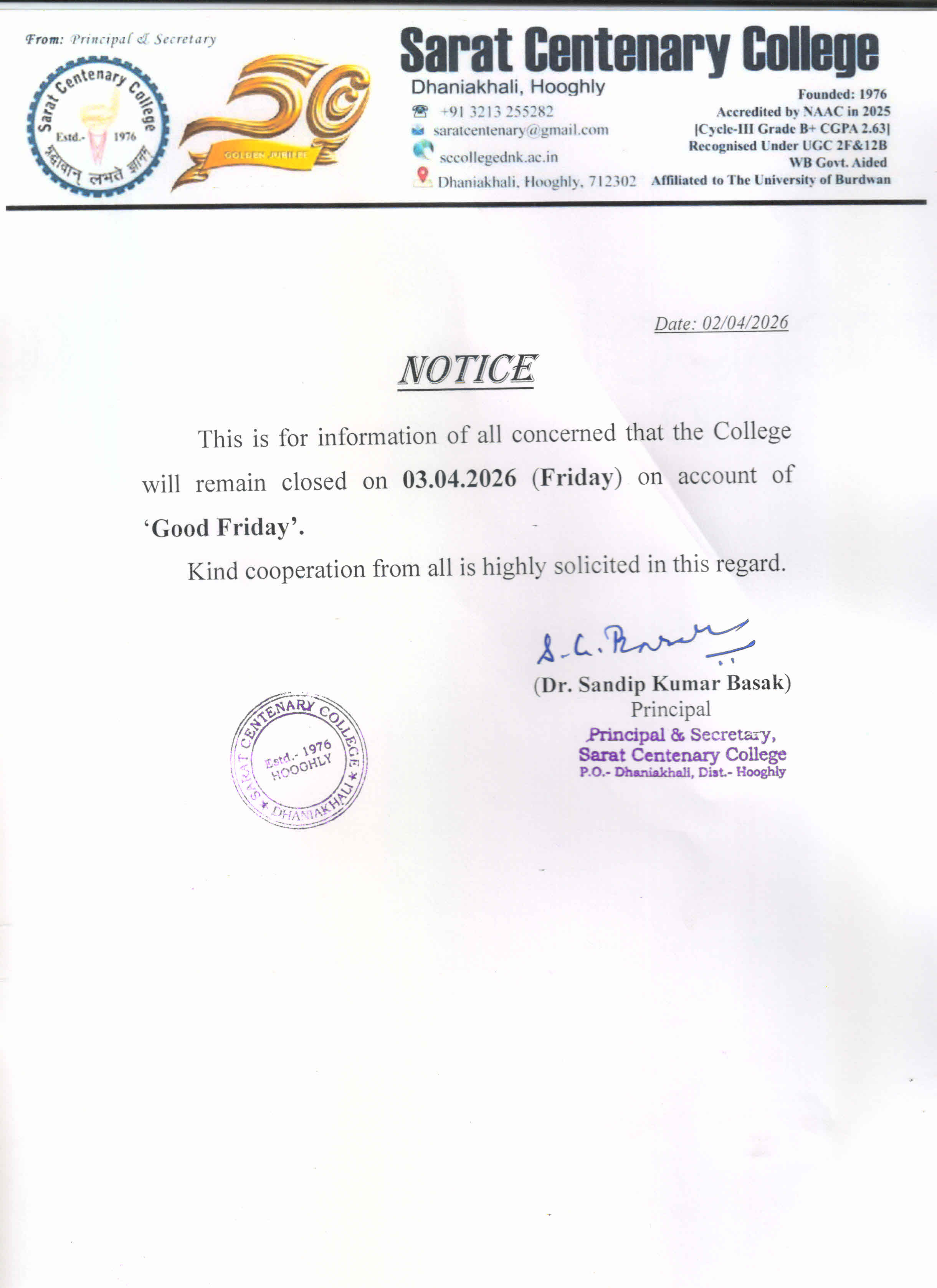 It was the ardent zeal for advancement of higher education that the people of Dhaniakhali to establish Sarat Centenary College, named after one of the greatest Bengali novelists, Sarat Chandra Chattopadhyay, in 1976 as a Junior Colleg