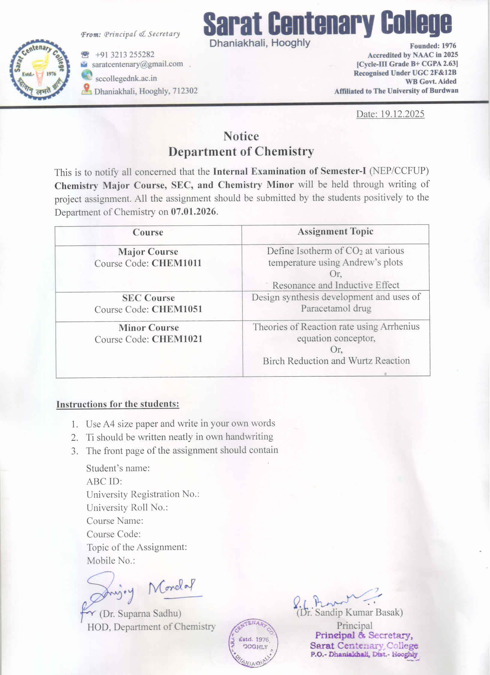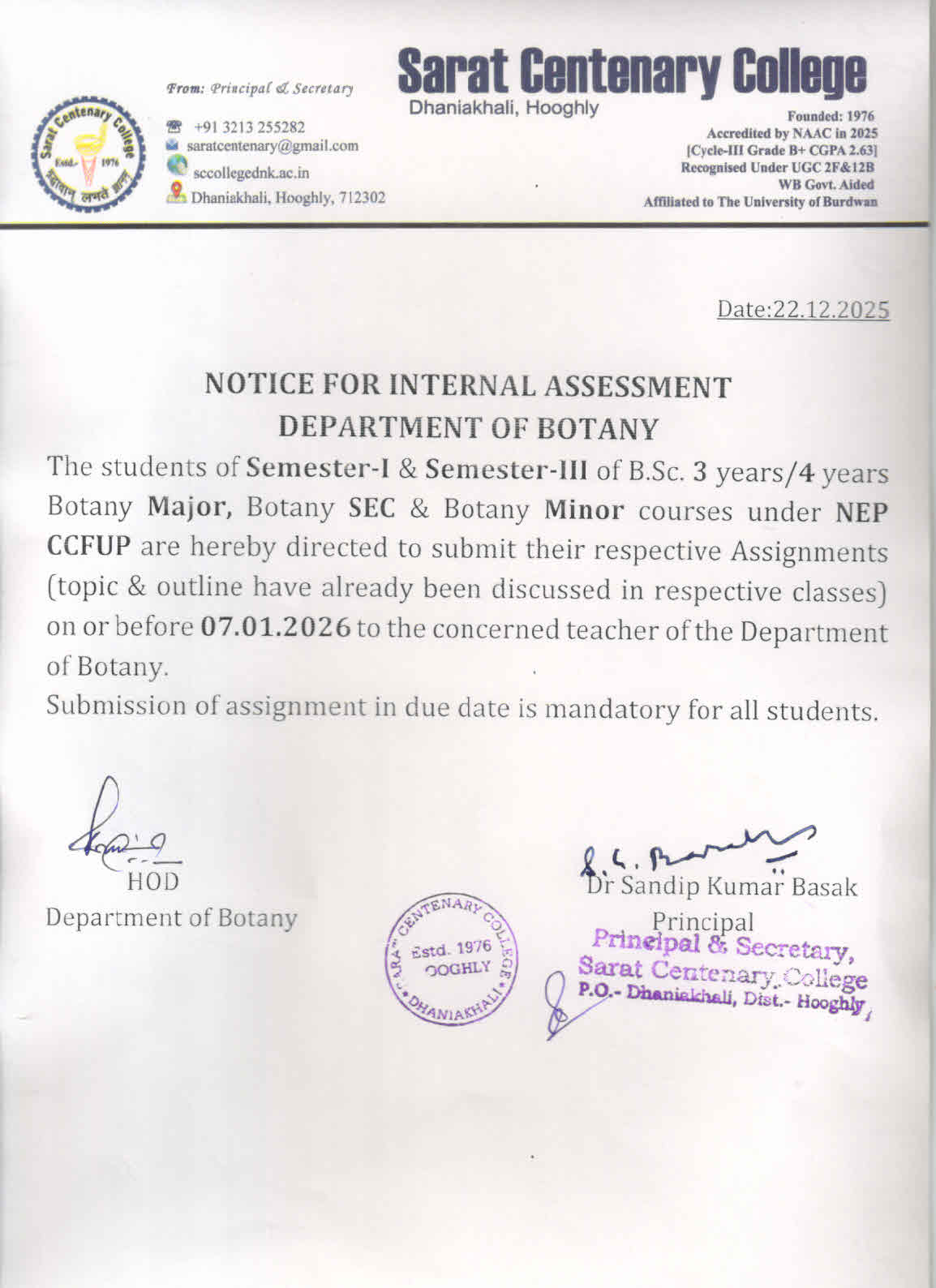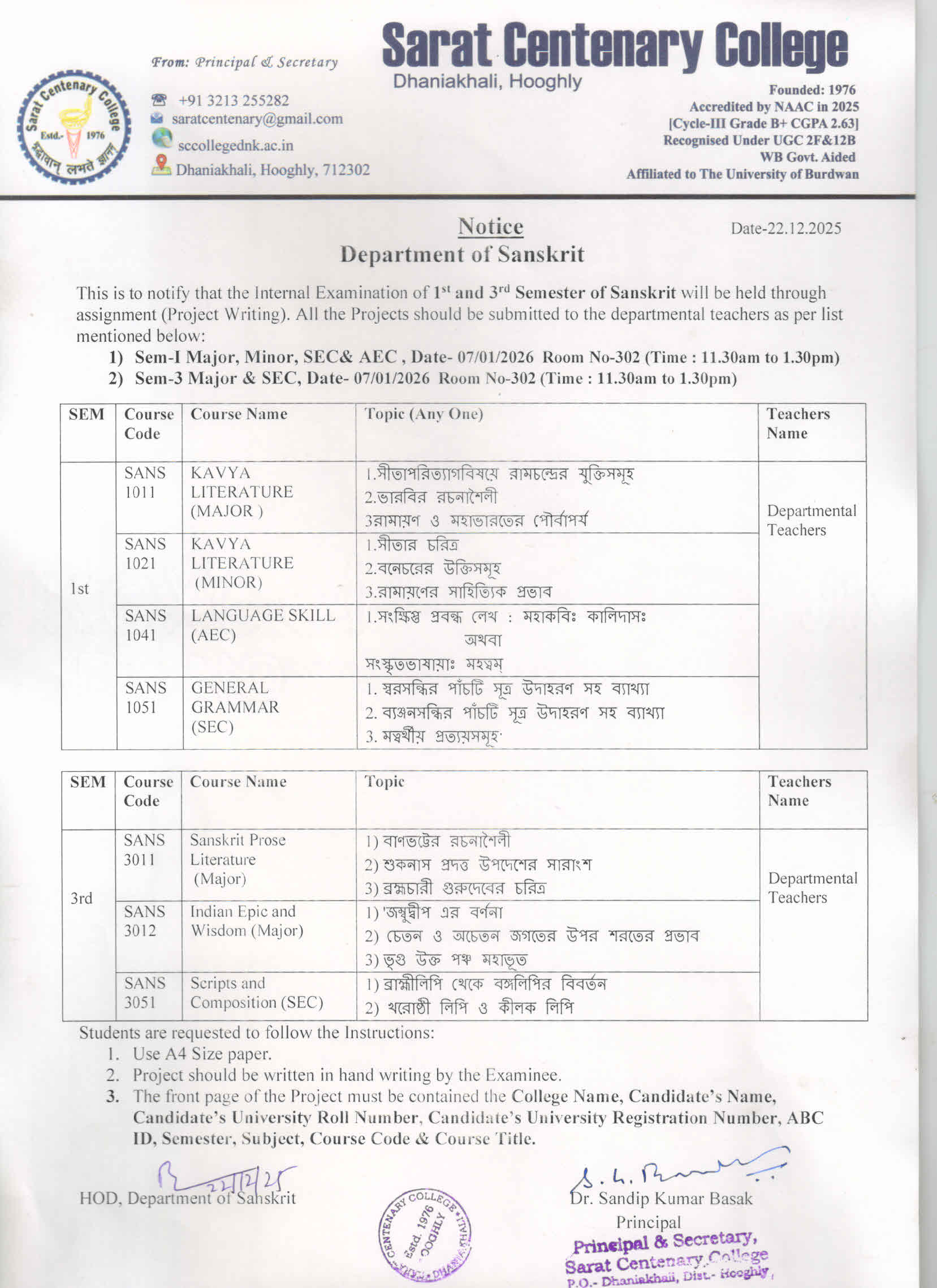 Notice for SEM-III Examination Form Fill up 2025 NEP & CBCS Regular & Back