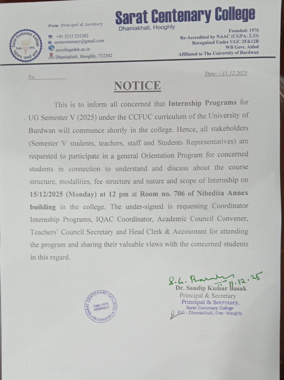Notice for Internship Programs for 5th Semester 11/12/2025