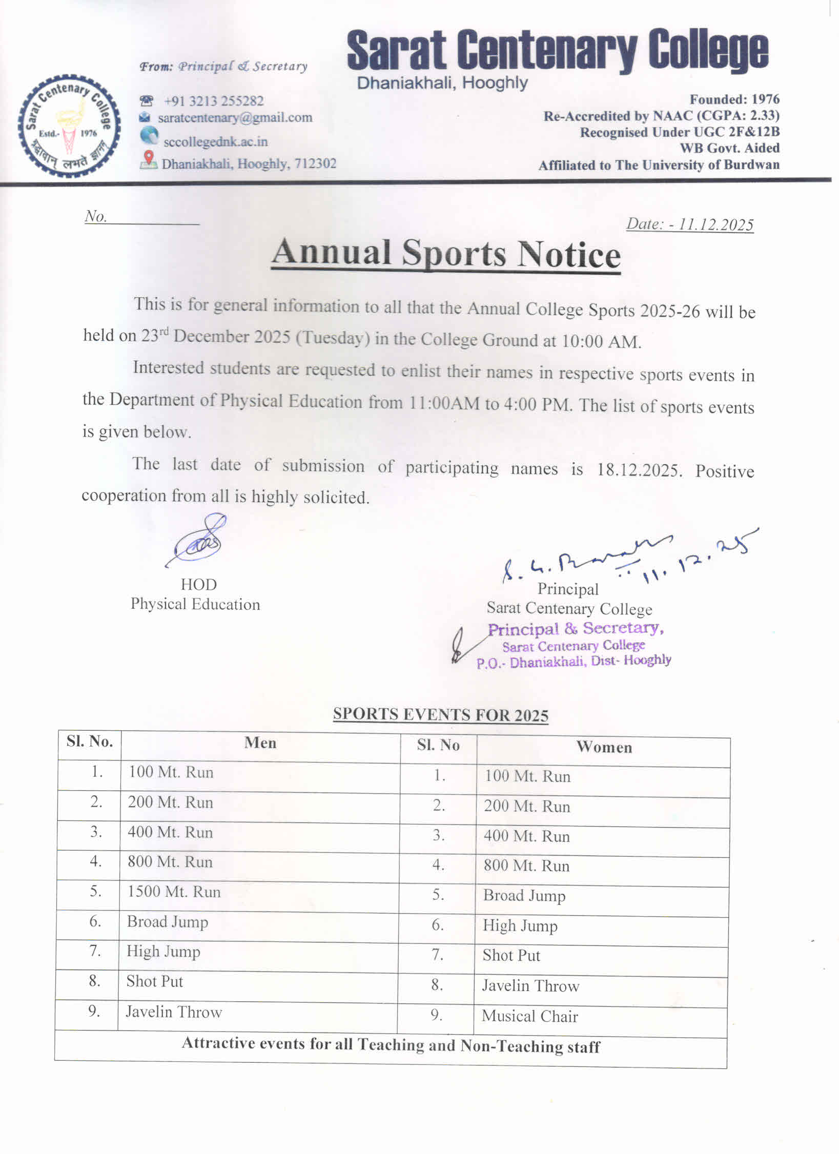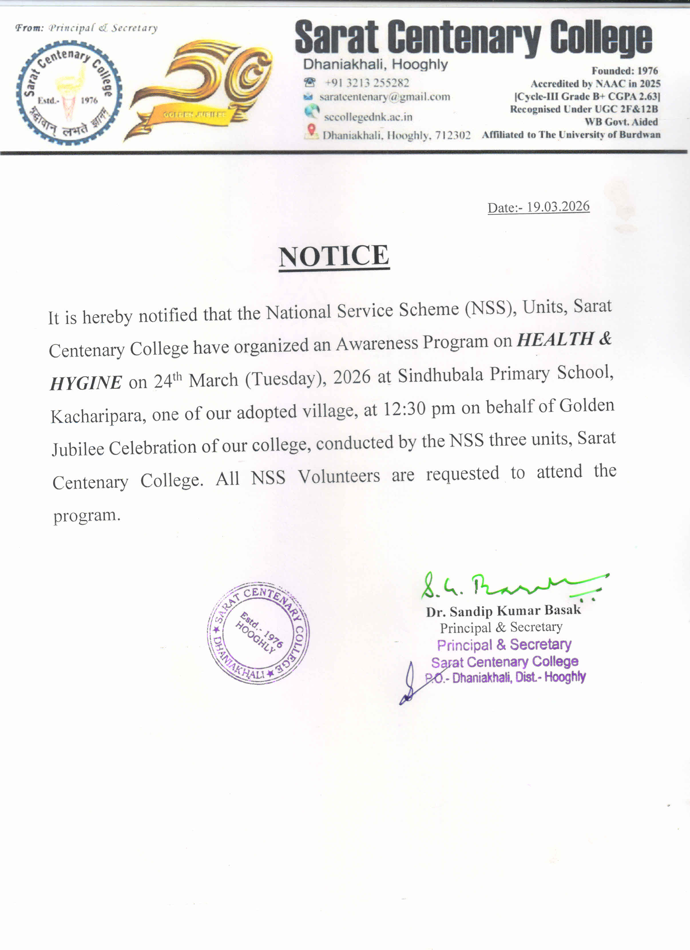 It was the ardent zeal for advancement of higher education that the people of Dhaniakhali to establish Sarat Centenary College, named after one of the greatest Bengali novelists, Sarat Chandra Chattopadhyay, in 1976 as a Junior Colleg