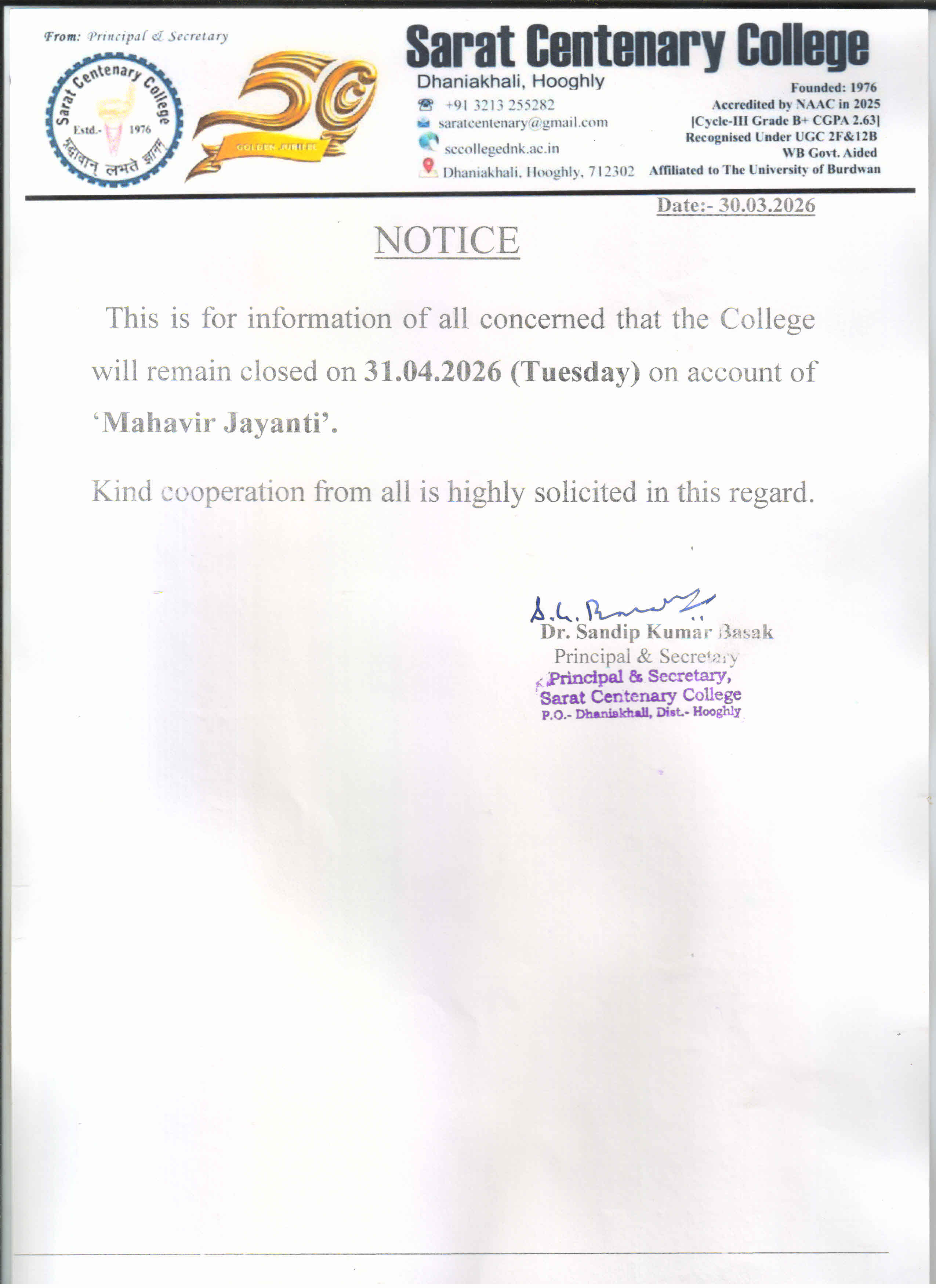 Notice Mahavir Jayanti 2026 30/03/2026