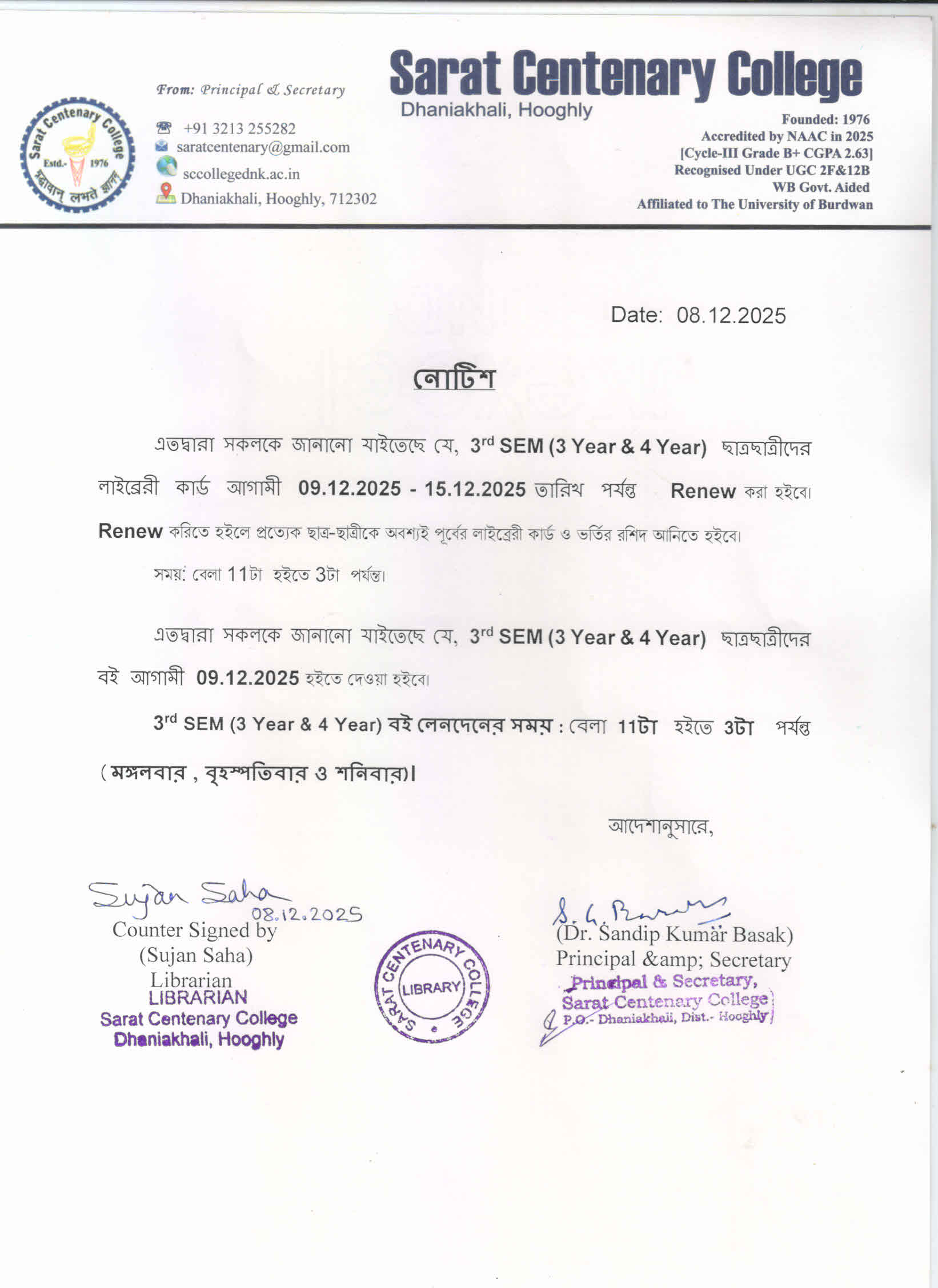 Notice for SEM-III Library Card Renewal 09/12/2025