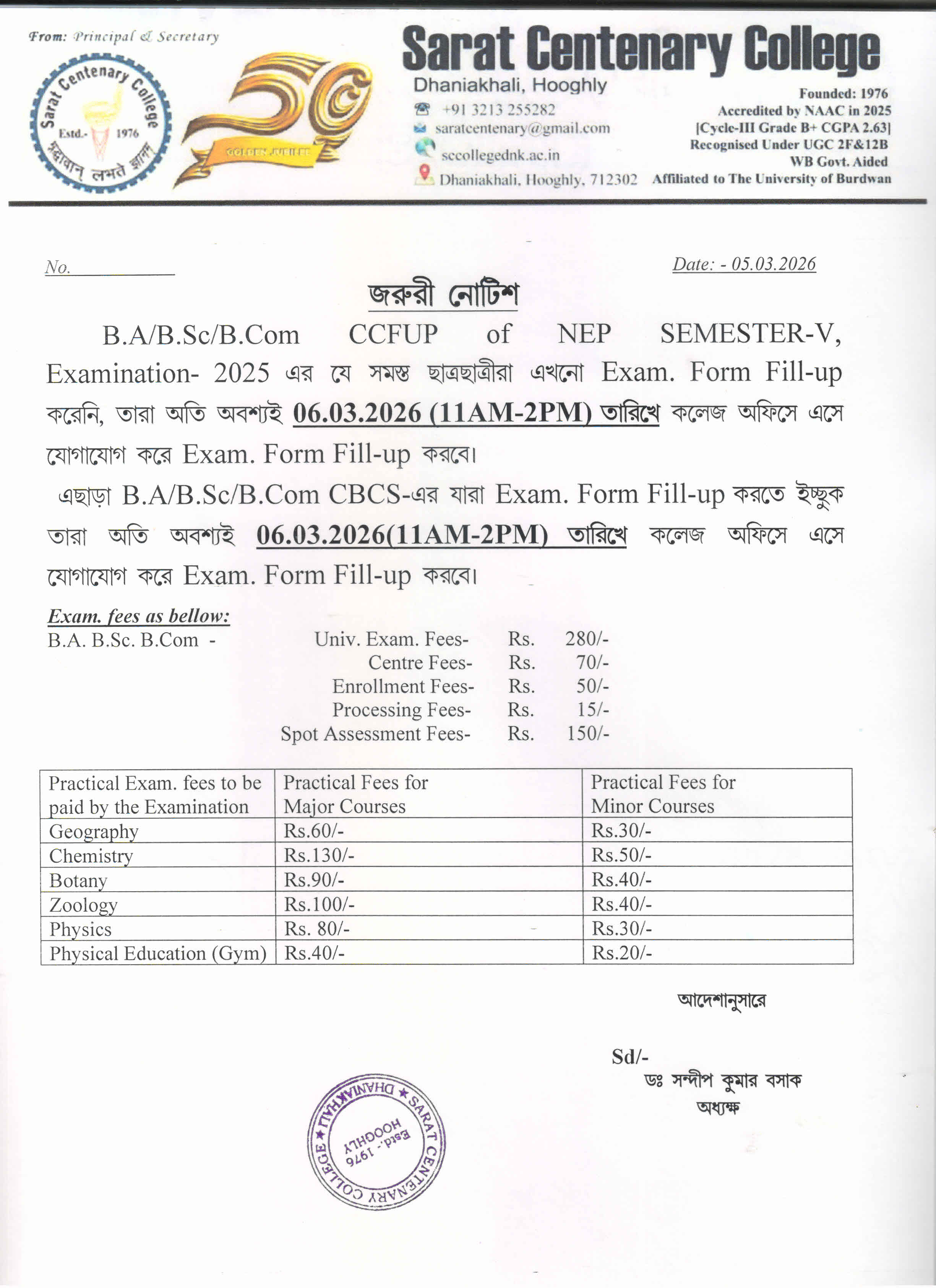 Notice for Sem-V NEP & CBCS Examination form fill up 2025 final 05/03/2026