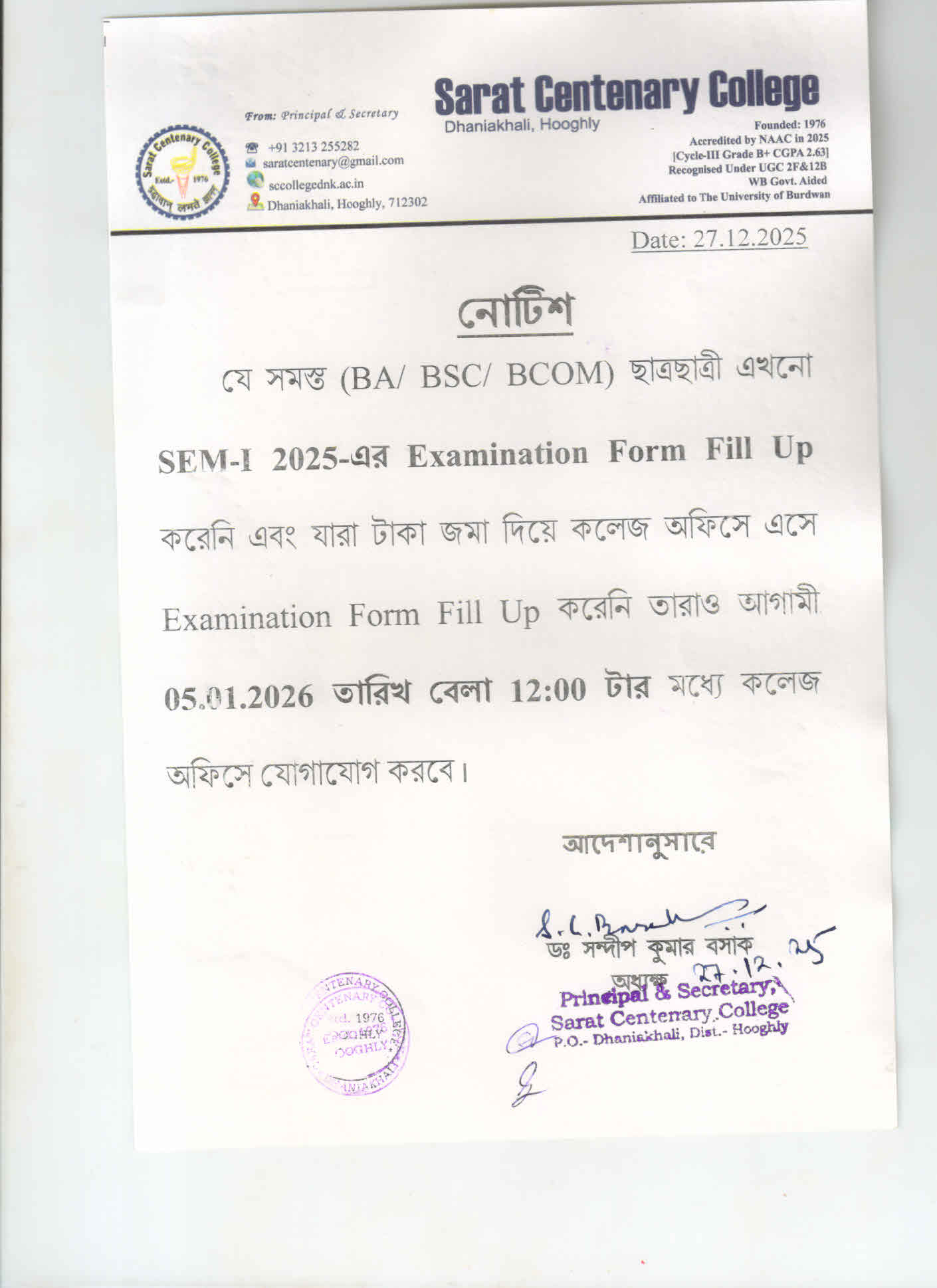 SEM-I Form Fill Up Regular & Back Final Date 27/12/2025