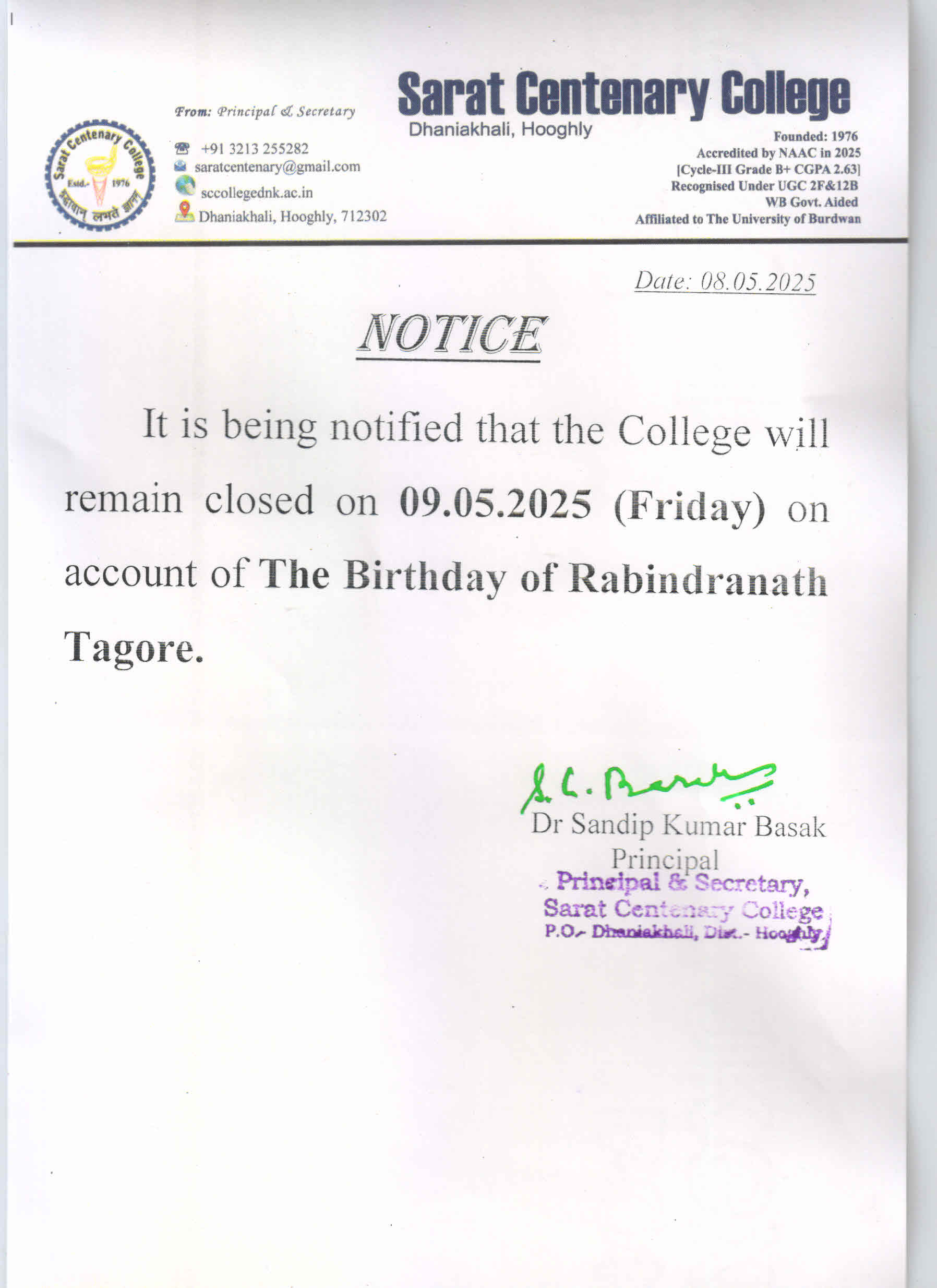 It was the ardent zeal for advancement of higher education that the people of Dhaniakhali to establish Sarat Centenary College, named after one of the greatest Bengali novelists, Sarat Chandra Chattopadhyay, in 1976 as a Junior Colleg